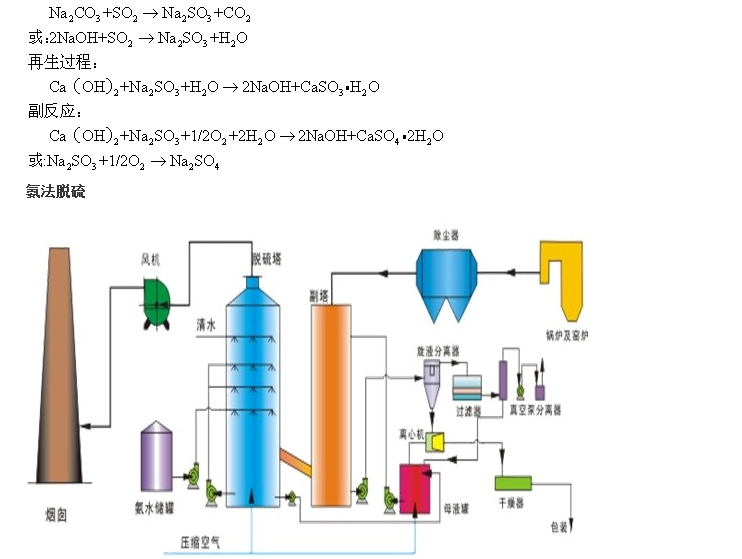 為了克服石灰/石灰石法容易結(jié)垢和堵塞的缺點(diǎn),發(fā)展了雙堿法。該法先用可溶性的堿性清液作為吸收劑吸收,然后再用石灰乳或石灰對(duì)吸收液進(jìn)行再生。反應(yīng)如下:脫硫過(guò)程